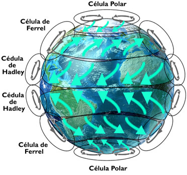Os ventos deslocam-se dos polos em direção aos trópicos, onde se aquecem e retornam às zonas polares.