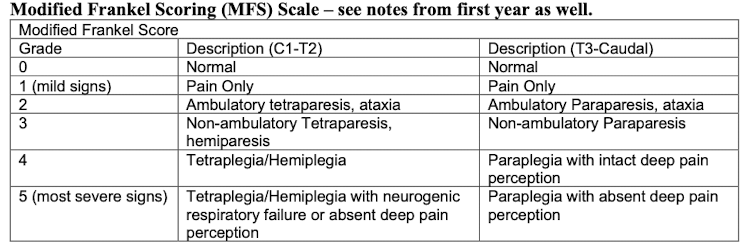- Grade 2 = Ambulatory paraparesis, ataxia