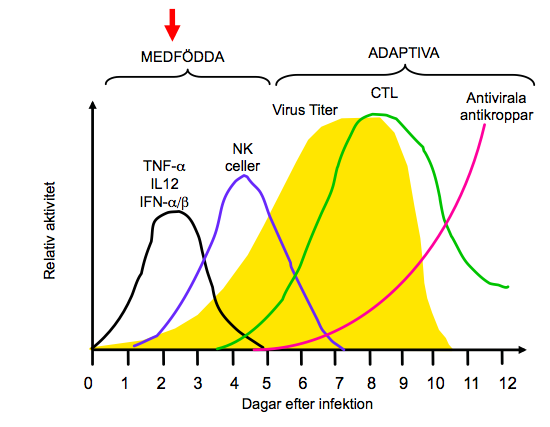 Värdens immunrespons på virusinfektion. Beskriv händelseförloppet (kurvorna).