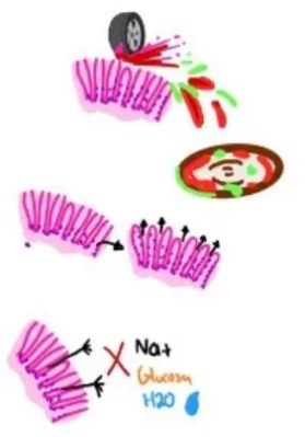 Diarrea osmótica (hemorrágica y con moco) por que hay disminución de absorción de sodio, glucosa y agua