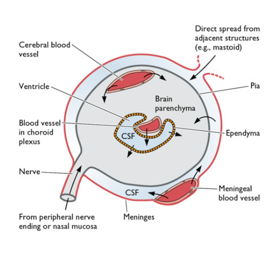 Can occur via cerebral blood vessels, choroid plexus or memingeal blood vessels