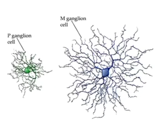 M cells (magnocellular): large cell bodies, large dendritic trees, 10% of all ganglion cells