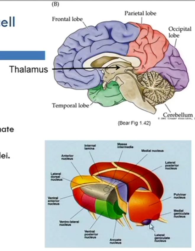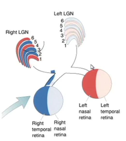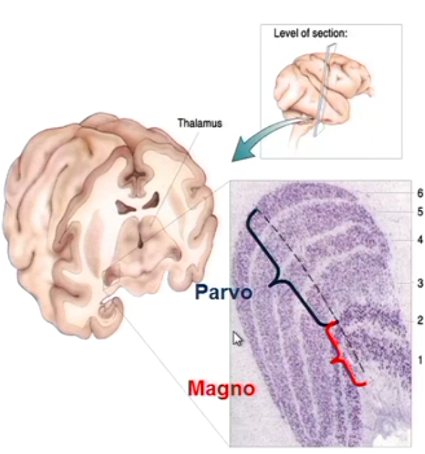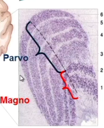 Two cell types: Magnocellular (layers 1,2) and Parvocellular (layers 3-6)