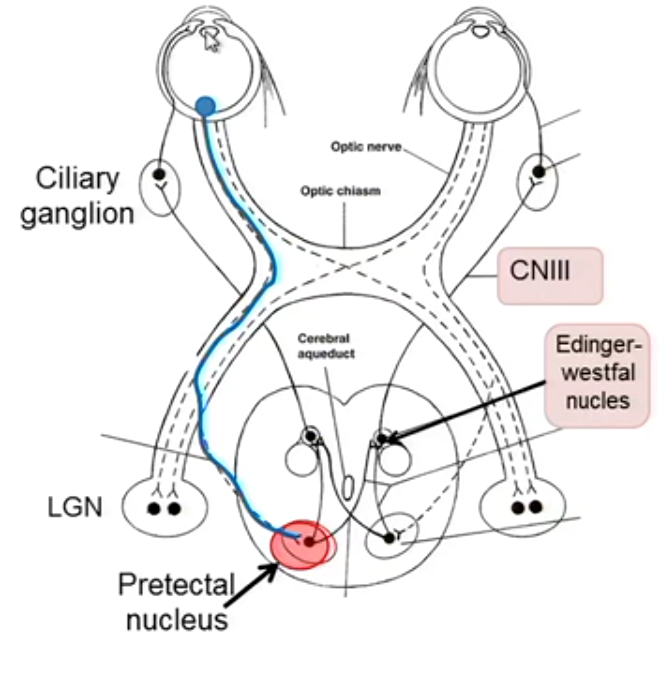 ipGCs detect light > project to the optical pretectal nucleus in the midbrain > send processes to Edinger-Westfal nucleus on each side > projections to each eye via ciliary ganglion