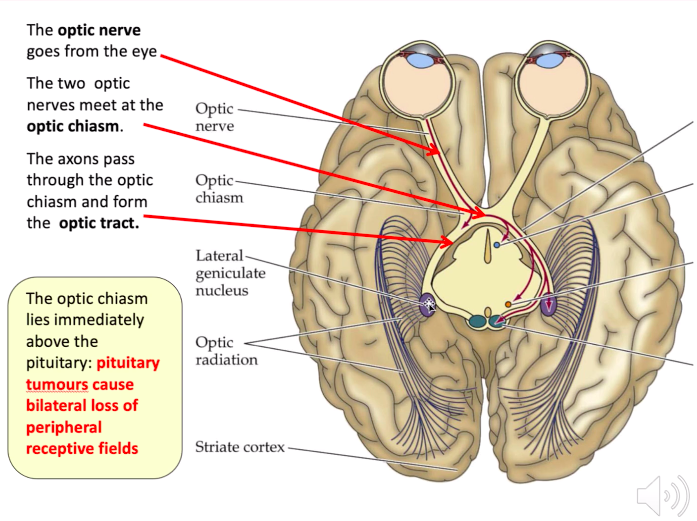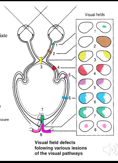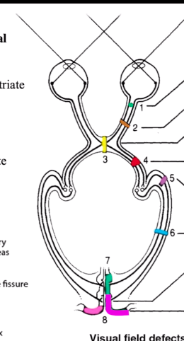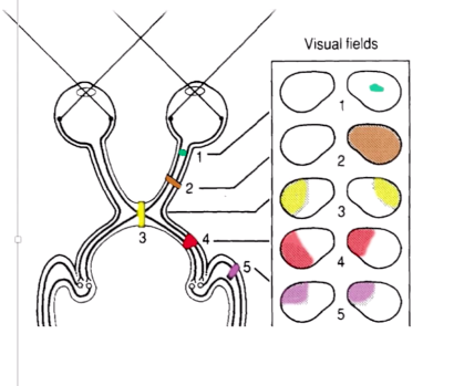 4: optic tract lesion = homonymous hemianopia - cant see lateral on one side & medial on the other