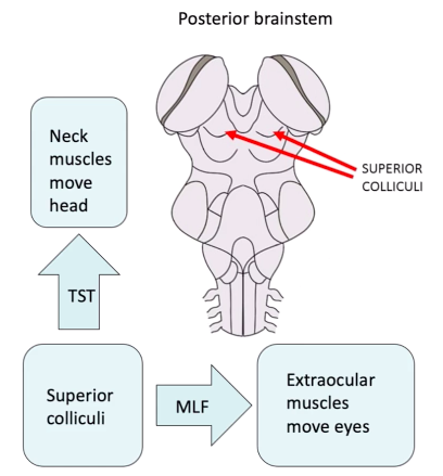 some optic nerve fibres go to the superior colliculi -> connects to the medial longitudinal fasciculi (MLF): links together and synchronises the oculomotor nuclei