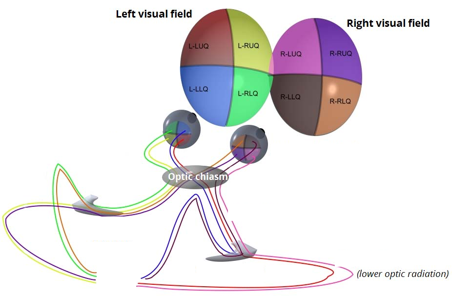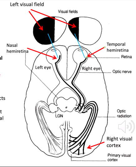 left visual field stimulates temporal hemiretina & stays on same side in optic chiasm go to lateral **geniculate nucleus on right hand side