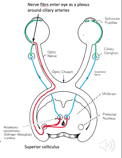 fibres leave Edinger-westphal nuclei & synapse at ciliary ganglia in orbit behind each eye