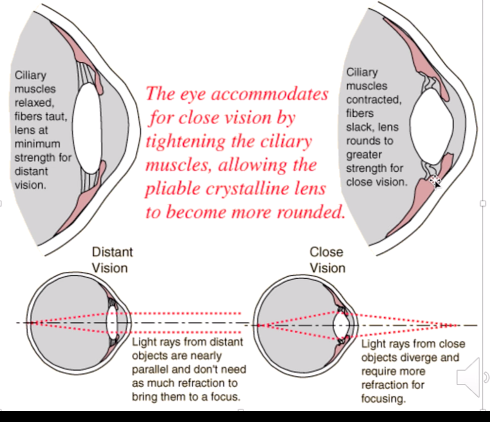 - ciliary muscle sphincter is contracts, suspension ligaments become slack: lens is fat