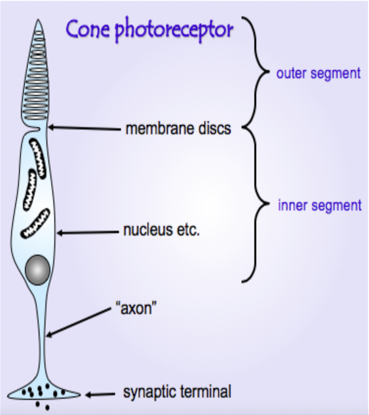 The axon: can’t fire APs - this is as electrotonic potentials=sufficient to transmit signals as the cones are small.