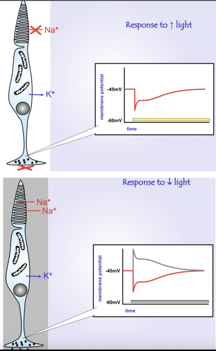 However, when light hits the outer segment, some Na channels close -> hyperpolarises the cell - Less glutamate is leaked as a result!