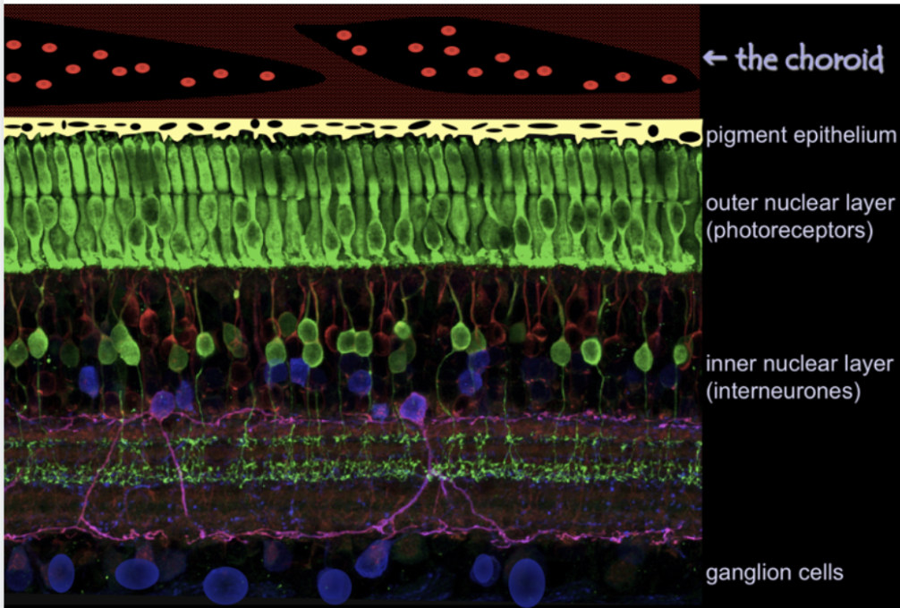 The outer PR segment (furthest from the light) is in contact w the RPE -> This forms the blood-retinal barrier