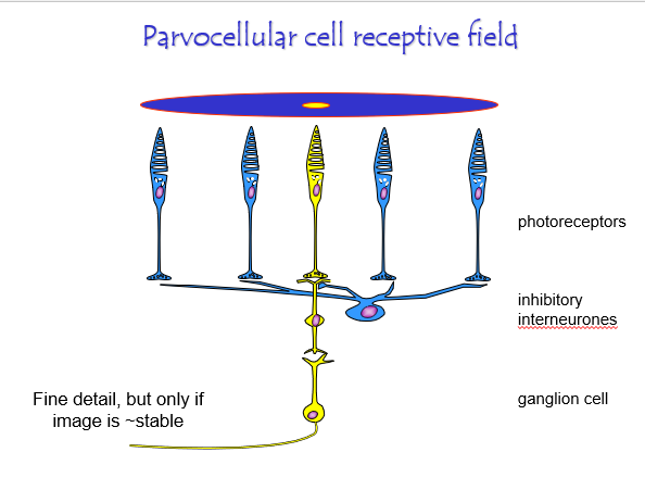 Parvocellular cells: fine detail + red-green colour. Small RF