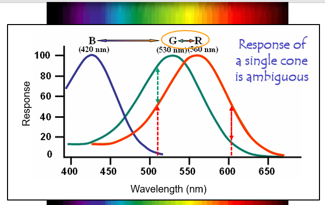 Parvocellular cells compare the ratio of Red: Green cone activation - the difference allows us to identify the wavelength!