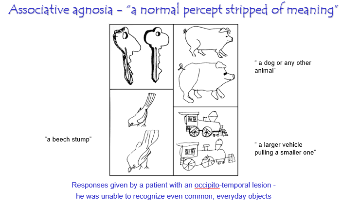 Lesions in this pathway ->Associative agnosia: pt can see an object/faces, but it has no meaning!