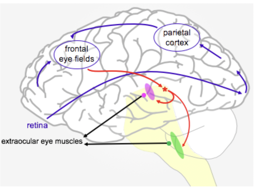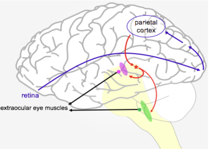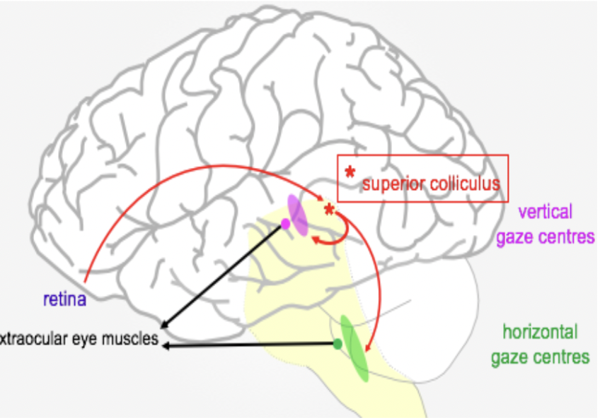 Parietal Cortical inputs direct where we look within the Broad image outline -> Superior colliculus (red star)