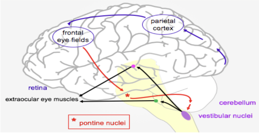 Spatial input from Parietal cortex -> Frontal eye fields -> Pontine nuclei→ Vestibular nuclei via the Cerebellum