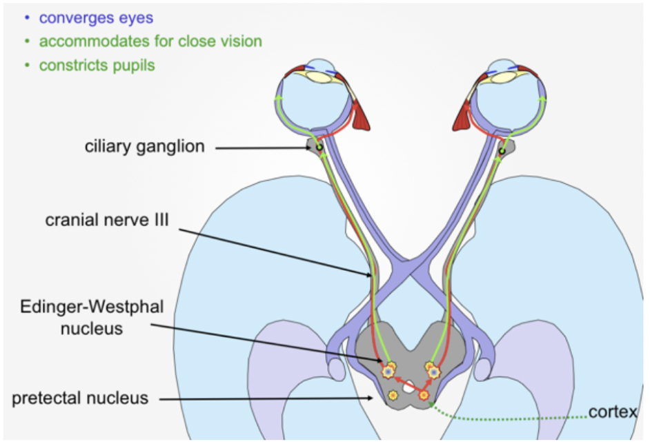 Pretectal nucleus activates both oculomotor + Edinger-Westphal nuclei