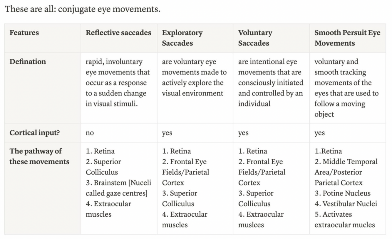Smooth pursuit: focuses on + follows an object, which must be fixed in the Fovea