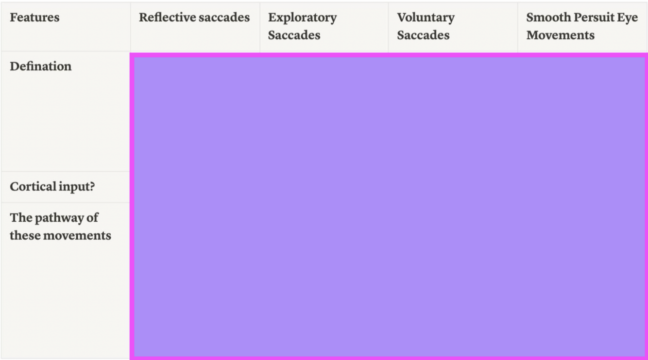 Reflexive saccades: no higher cortical input - happens reflexively in response to something entering our visual field