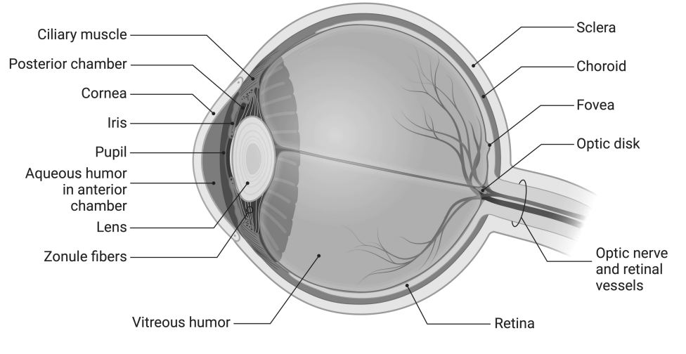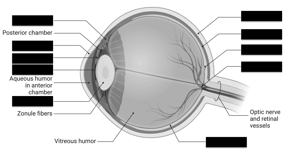 Contains muscles that control the shape of the lens for focusing and produces aqueous humor, the fluid in the eye.