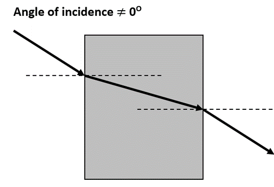 Light ray is refracted at air/glass boundary and glass/ air boundary. Both result in a change of direction.