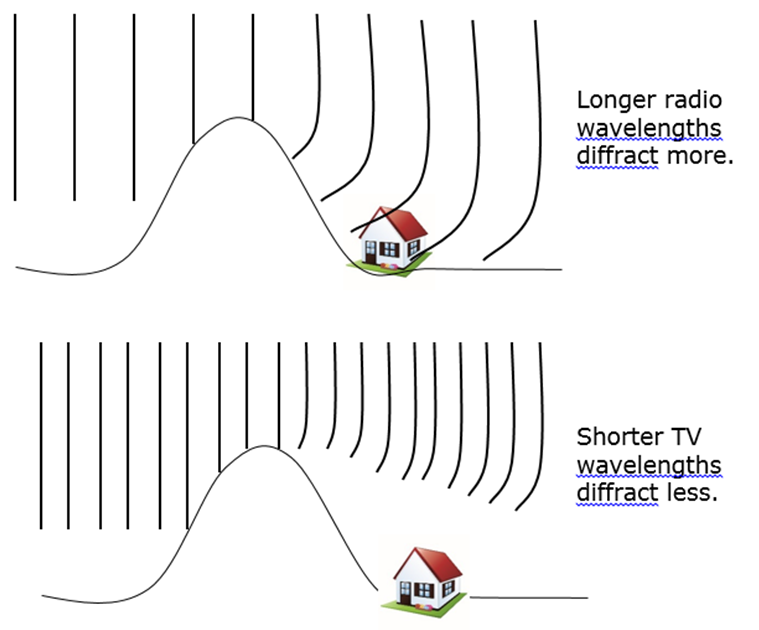 Radio waves diffract more and can reach the receiver.