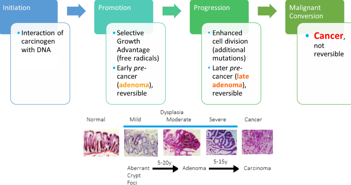 progression- acquisition of specific mutations. clonal expansion (by tumour promoters). loss of heterozygosity- genomic instability. epigenetic changes.