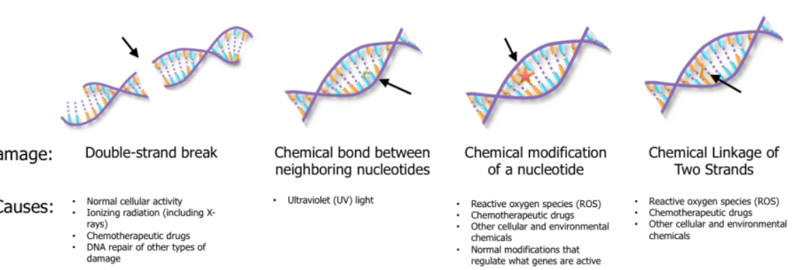 UV radiation- causes thymine dimers ‘kinking’ dna