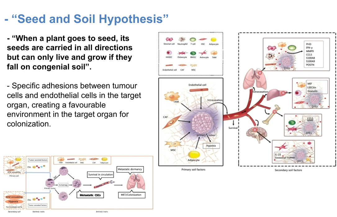 metastasis- frequent extravasation (80%) but poor ‘seeding’ in other tissues (0.02%) requires EMT –> MET to properly grow. need specific adhesion between tumour cells and endothelial cells in target organ to create a favourable environment.