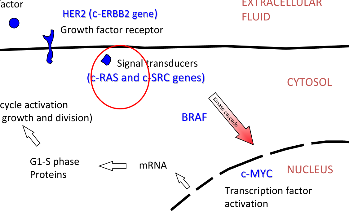 HER-2 human epidermal growth factor 2. needs to dimerise to function. normally stimmed by growth factors. when activated RAS, MEK, RAF pathway stim growth. This can be genetically amplified - more activation- more growth. can target this with monocolnal antibodies.