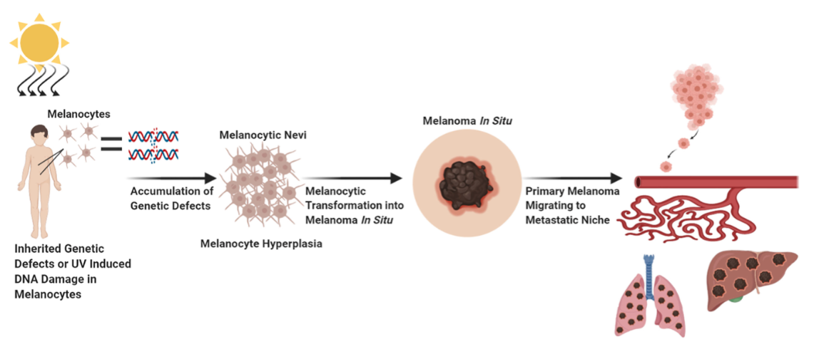 Outline the pathogenesis of malignant melanoma with specific reference to the role of sun exposure