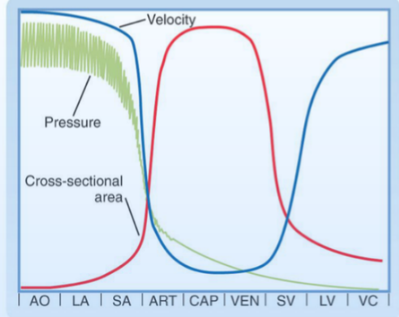 Arterial branches → arterioles → capillaries → venules → venous branches