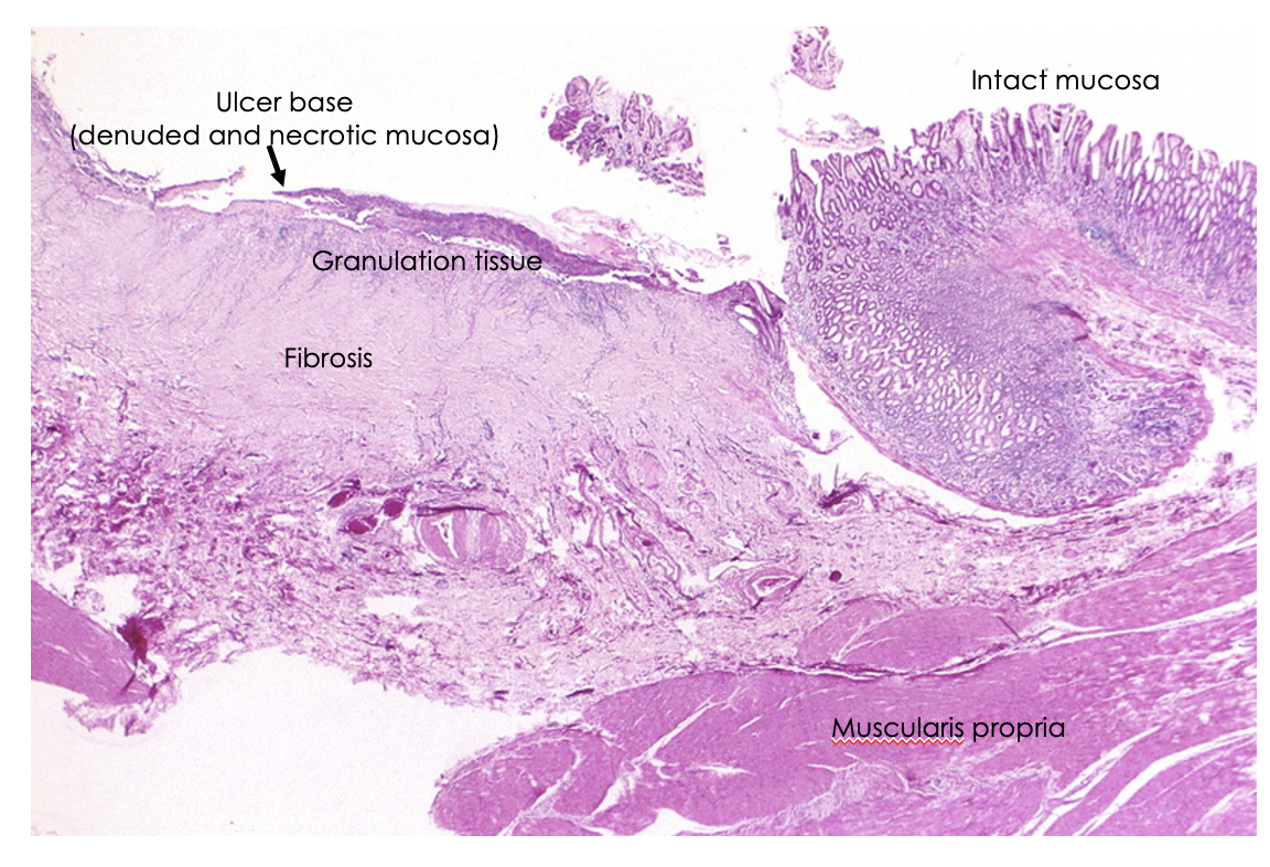 Depth of the mucosal break. An ulcer penetrates the muscularis mucosae whereas an erosion does not.