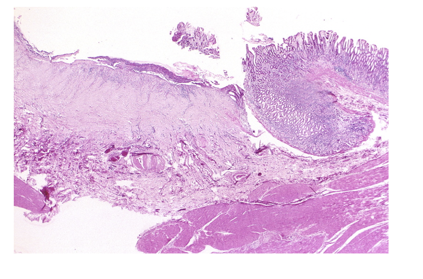 A peptic ulcer is the focal destruction and loss of gastric or duodenal mucosa, the sub-mucosa, and frequently the underlying muscularis mucosae. A perforating ulcer is an ulcer that perforates through the entire wall of the stomach or duodenum.