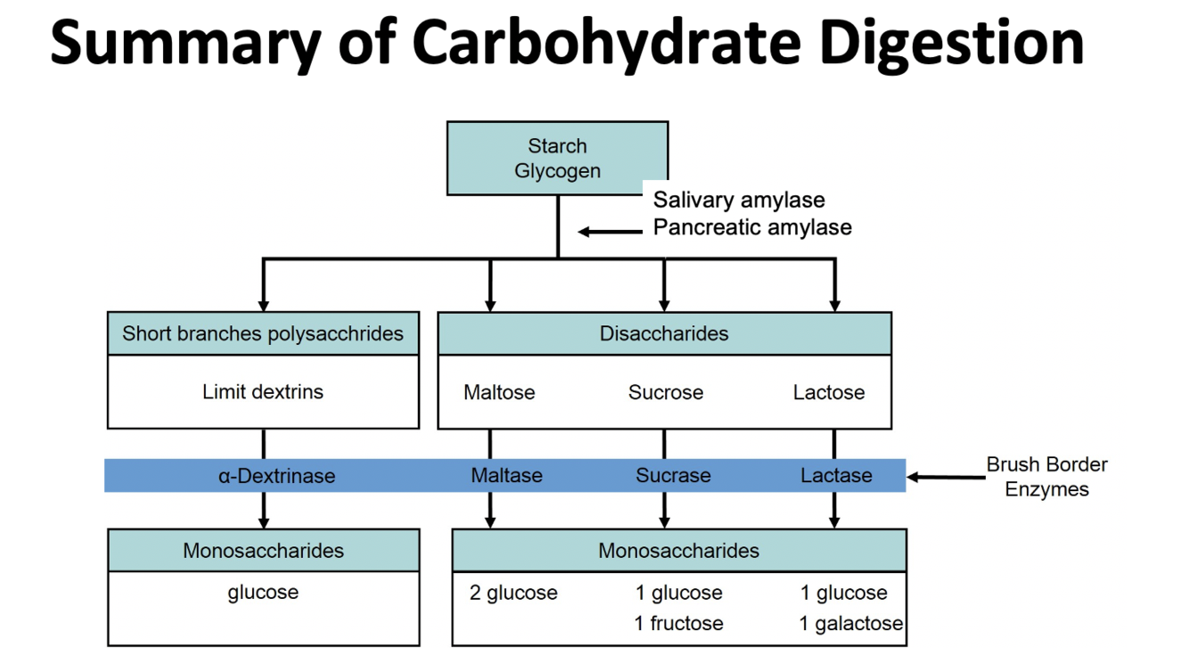 Potatoes have starch and non-starch polysaccharides (NSP) (dietary fiber) and absorb from the duodenum (after being exposed to pancreatic digestive enzymes). Most carbohydrates are ingested as starch, a polymer of glucose (polysaccharide). The two main types are amylose and amylopectin and they absorb the same way: Digestion begins in the mouth by salivary amylase. As food moves into the stomach salivary amylase continues to digest CH-ates before getting neutralized by the low gastric pH. Pancreatic amylase then converts polys-s first to oligosaccharides and maltotriose then di-saccharides: maltose, sucrose and lactose are produced. Small-intestinal brush border enzymes hydrolyze oligosaccharides further into monosaccharides (see glucose, galactose and fructose on the figure).