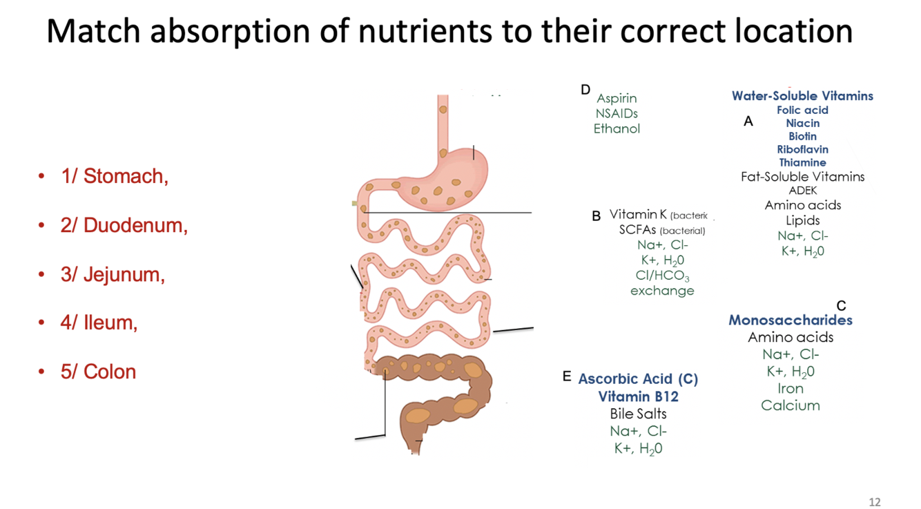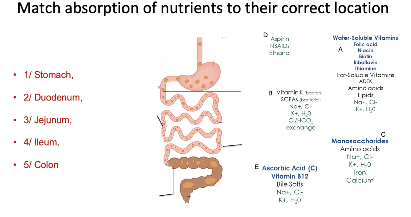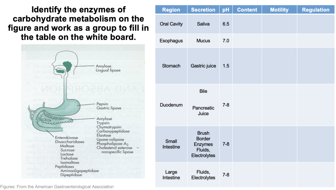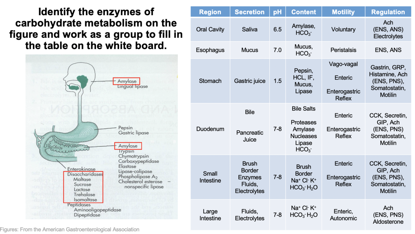 Students should recap this. Proteins begin be digested in the stomach at acidy pH by pepsin. Moving into the duodenum the chime will mix with excretions of higher pH and become slightly alkalinic. It is at this pH that pancreatic digestive enzymes work best – trypsin, chymotrypsin, carboxypeptidases and elastase are at work here. Oligopeptides are further decomposed at the brush border and either di/tripeptides or single amino acids are actively transported into the SB cell.