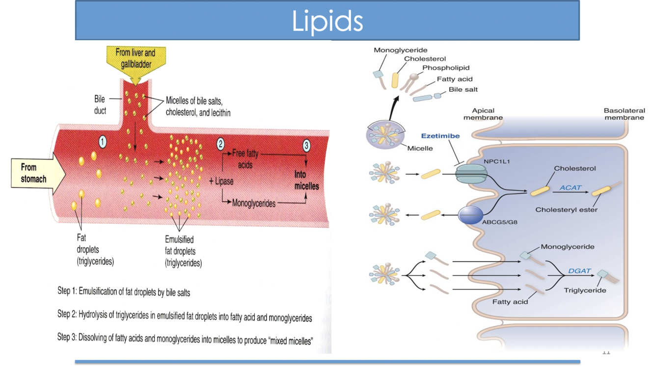 Red meat (burgers) is particulary fat-rich (LDL/cholesterol). Fats are first reached by lingual and gastric lipase. TG droplets arriving from the stomach will mix in the duodenum/jejunum with micelles arriving in the bile: and will be emulsified by bile salts. Micelles will disperse large dietary fat droplets into small ones by changing them into a water-soluble complex. As pancreatic lipase is a hydrophilic enzyme it breaks TGs into monoglycerides and FFAs more efficiently this way. These then are picked up by the micelles to form “mixed micelles”. These have a phospholipid structure with cholesterol and bile salt. Both monoglycerides and fatty acids are taken up into cells where DGAT (diglyceride acyltransferase) builds them into triglycerides which then will be packaed into chylomicrons. Microvillus membrane fatty acid–binding protein (MVM-FABP) for transport of long-chain fatty acids. Also cholesterol is taken up into cells where it will be esterificated. Chylomicrons will leave the SB and enter circulation via the lymph. After lipids absorbed from the jejunum, bile salts are re-absorbed in the terminal ileum (entero-hepatic circulation).