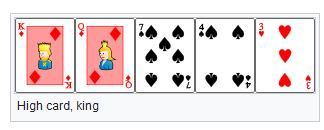 High card, also known as no pair or simply nothing, is a hand that does not fall into any other category, such as K♥ J♥ 8♣ 7♦ 4♠ (“high card, king” or “king-jack-high” or “king-high”). Note that under ace-to-five low rules, straights, flushes and straight flushes are not possible, so such hands are instead high card hands.[8] It ranks below one pair.