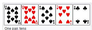One pair, or simply a pair, is a hand that contains two cards of one rank and three cards of three other ranks (the kickers), such as 4♥ 4♠ K♠ 10♦ 5♠ (“one pair, fours” or a “pair of fours”). It ranks below two pair and above high card.