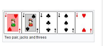 Two pair is a hand that contains two cards of one rank, two cards of another rank and one card of a third rank (the kicker), such as J♥ J♣ 4♣ 4♠ 9♥ (“two pair, jacks and fours” or “two pair, jacks over fours” or “jacks up”). It ranks below three of a kind and above one pair.