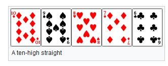 A straight is a hand that contains five cards of sequential rank, not all of the same suit, such as 7♣ 6♠ 5♠ 4♥ 3♥ (a “seven-high straight”). It ranks below a flush and above three of a kind.[6] Under high rules, an ace can rank either high (as in A♦ K♣ Q♣ J♦ 10♠, an ace-high straight) or low (as in 5♣ 4♦ 3♥ 2♥ A♠, a five-high straight), but cannot simultaneously rank both high and low (so Q♠ K♠ A♣ 2♥ 3♦ is an ace-high hand).[7][15] Under deuce-to-seven low rules, an ace always ranks high (so 5♥ 4♠ 3♥ 2♣ A♦ is an ace-high hand). Under ace-to-six low rules, an ace always ranks low (so A♣ K♠ Q♠ J♦ 10♠ is a king-high hand).[16] Under ace-to-five low rules, straights are not possible (so 10♥ 9♠ 8♣ 7♣ 6♦ is a ten-high hand).