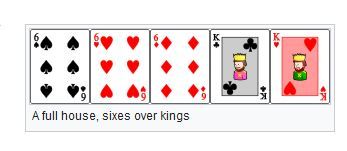A full house, also known as a full boat or a boat (and originally called a full hand), is a hand that contains three cards of one rank and two cards of another rank, such as 3♣ 3♠ 3♦ 6♣ 6♥ (a “full house, threes over sixes” or “threes full of sixes” or “threes full”). It ranks below four of a kind and above a flush.