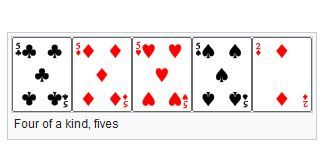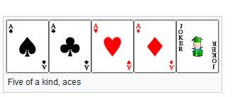 Five of a kind is a hand that contains five cards of one rank, such as 3♥ 3♦ 3♣ 3♠ 3 (“five of a kind, threes”). It ranks above a straight flush but is only possible when using one or more wild cards, as there are only four cards of each rank in the deck. Five of a kind, aces, A♥ A♦ A♣ A♠ Jkr, becomes possible when a joker is added to the deck as a bug, a form of wild card that may act as a fifth ace.Other wild card rules allow jokers or other designated cards to represent any card in the deck, making it possible to form five of a kind of any rank.