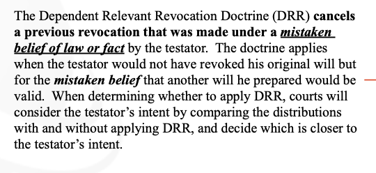 Under Dependent Relative Revocation, the revoked clause may be reinstated if (1) the revocation was based on a mistake of fact or law and (2) but for the mistake, the testator would not have made the revocation. If the interlineated gift is larger, reinstate the gift. If it’s smaller, maintain the revocation.