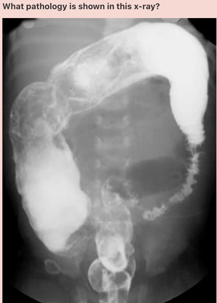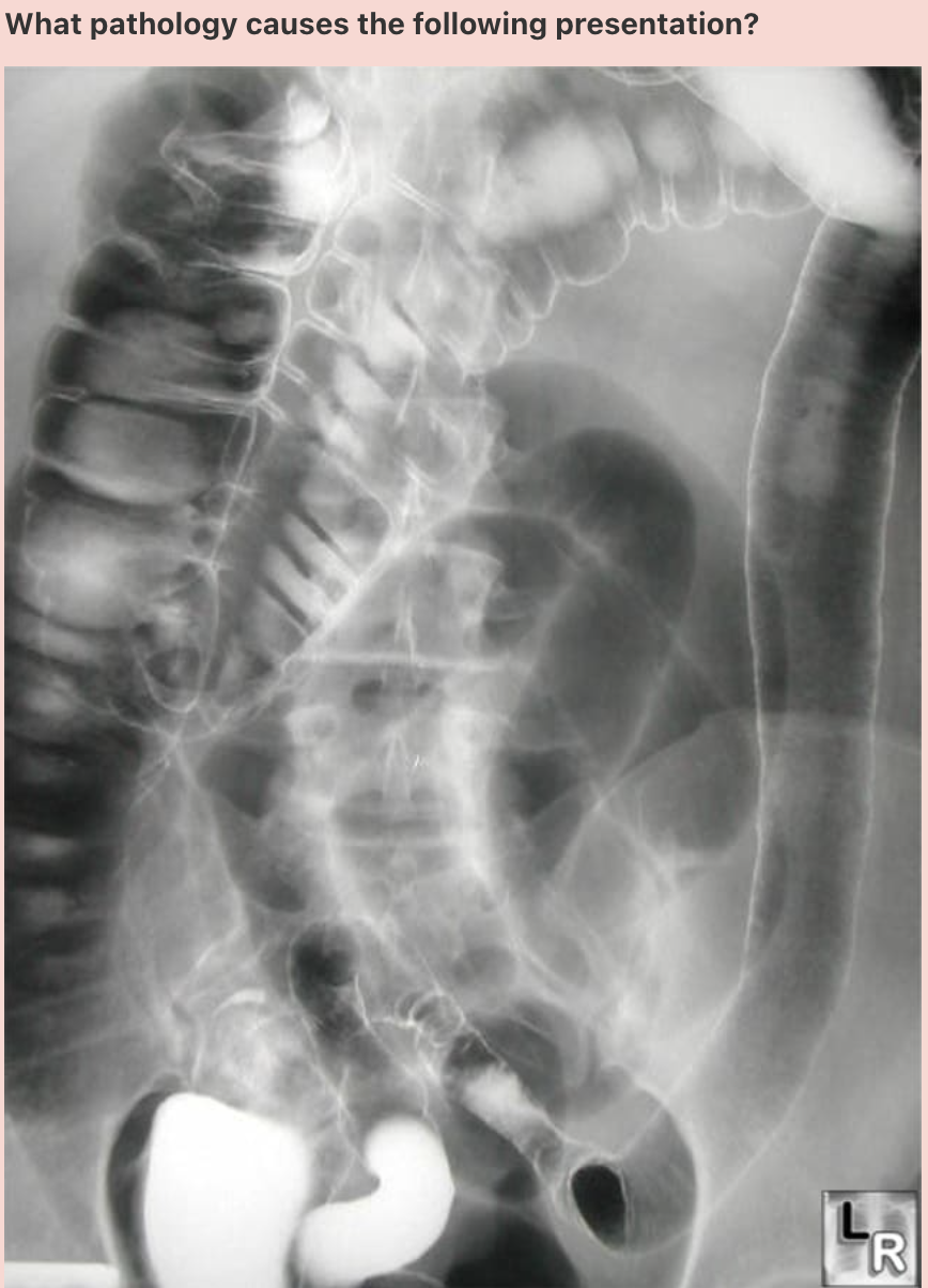 Explanation: Known as ‘string sign’, this observation is classically found in Crohn’s disease. It occurs in both stenotic and non-stenotic phases of the disease; in non-stenotic regions, it is of variable width and is secondary to oedema and GI spasm. In stenotic regions, the diameter is fixed secondary to the scarring and fibrosis seen in severe Crohn’s disease presentations.