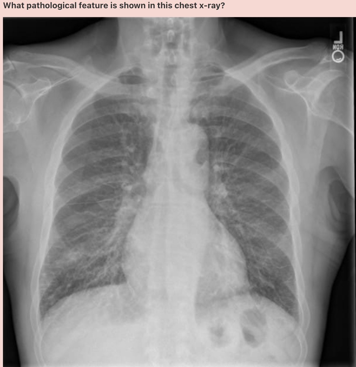 In normal subjects, the diaphragm is intersected by the 5th to 7th anterior ribs in the mid-clavicular line - in this patient you can count up to 9 ribs before reaching the diaphragm - > hyperexpanded lungs.