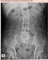 Note the areas of increased radio-opacity in the left upper quadrant. This is where the pancreas has calcified, after chronic inflammation and subsequent fibrosis.