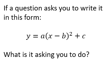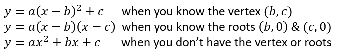 What are the 3 forms of the quadratic equation and when would you use them in a modelling question?
